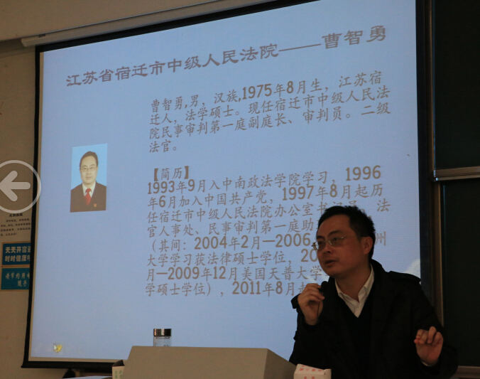 2015年4月15日下午,宿迁市中级人民法院民一庭副庭长、根据“双千计划”担任中文字幕无码视频院长助理的曹智勇法官,给中文字幕无码视频的本科生和部分研究生做了主题为《法官审理民事案件的经验和体会》的讲座。
