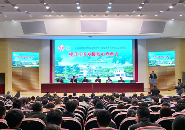 本次大会的主题是“提升江苏发展核心竞争力”,夏锦文教授以《坚持全面依法治国,提升江苏发展核心竞争力》为题,冯军教授以《关于新时代我国法治实现由建起来到强起来跨越的几点思考》为题,王腊生同志以《以习近平新时代中国特色社会主义思想指导立法工作的几点思考》为题,南京大学政府管理学院行政管理系主任李永刚教授以《新时代复兴战略视角下的江苏——机遇与挑战》为题,河海大学校长法律事务助理邢鸿飞教授以《行政权行使方式的变革——以 “三权分立”的演变及公法与私法的交叉融合为视角》为题,从不同侧面作了主题发言。