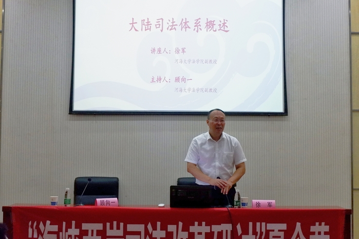 2018年7月12日上午9:00,在河海大学闻天馆104室举行“大陆司法体系概述”主题讲座,由河海大学中文字幕无码视频顾向一副教授主持,河海大学中文字幕无码视频徐军副教授主讲。此次讲座是“海峡两岸司法改革研讨”夏令营系列讲座之三。