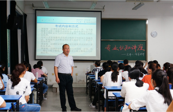 本次讲座主要包括法学的学科与专业概况、法律职业及发展、国家统一法律职业资格考试的动向等几个方面。徐军老师大致介绍了法学本科阶段所要学习和掌握的法的一般理论和主要部门法学课程,并建议同学们利用课余时间阅读《中国特色社会主义法律体系》(白皮书),以对我国的主要法律部门有个初步的了解。此外,他还介绍了改革开放四十年间的我国法制(法治)建设的巨大成就,联系热点案例、事件展示了法律在社会生活各方面发挥的巨大作用。在介绍了理论法学、应用法学各自的特点以后,徐军老师为同学们讲解了包含本科与硕、博士研究生阶段的法学学科、专业设置,以加深新生初次接触法学专业时对所学课程所属领域的了解。根据近年来相关政策和法律的变化,徐军老师详细解读了在全面推进依法治国的背景下社会各领域对法律人才的大量需求,解释了法律从业人员的范围和区别以及取得法律职业资格的条件,指出从事法律职业不仅需要具备相当的理论功底,还要锤炼事实认定、法律适用等方面的实践能力。