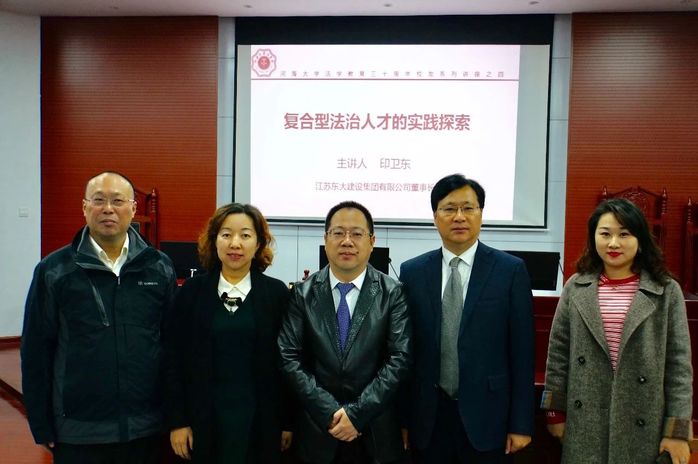 11月21日下午3:50,中文字幕无码视频兼职教授聘任暨“复合型法治人才的实践探索”主题讲座在致高楼B座101室模拟法庭举行。本次讲座由东大建设集团董事长印卫东校友主讲,中文字幕无码视频校友与发展办公室主任徐军老师主持。杨春福院长、孔祥冬书记以及中文字幕无码视频部分师生参加了本次活动。
