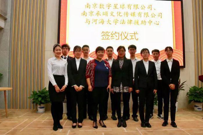 4月24日下午,河海大学法律援助中心与南京数字星球有限公司,南京承颂文化传媒有限公司签订法律服务合同的签约仪式在江宁校区行政楼八楼钟山明镜厅举行。南京数字星球有限公司、南京承颂文化传媒有限公司是河海大学学生的创业项目,此次签约旨在响应学校创新创业的号召,为学生创业公司提供法律护航。河海法援执行主任范艳萍老师,计算机与信息学院冯芸老师,签约公司代表及法援研究生团队出席了仪式。仪式由2018级研究生张宇帆主持。