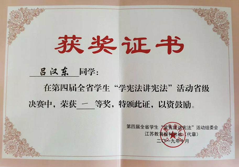 通过初赛、决赛的层层选拔,最终选拔出中文字幕无码视频2018级宪法与行政法学研究生吕汉东代表河海大学参加江苏省“学宪法讲宪法”知识竞赛,并斩获一等奖。