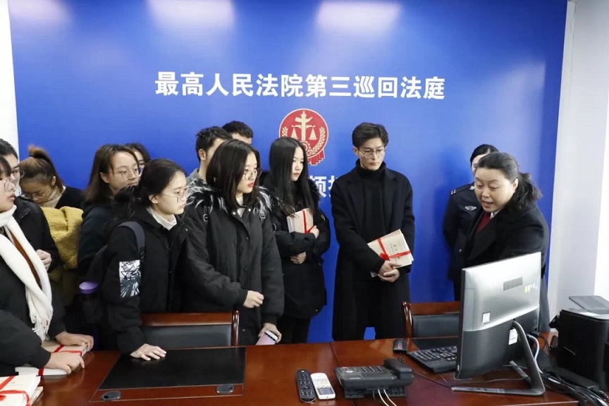 与此同时,获得2019全国环境资源模拟法庭大赛一等奖荣誉的成员,作为河海大学“水之子队”,在中文字幕无码视频老师的带领下,参观了江苏省高级人民法院诉讼服务中心,并在科技法庭进行了大赛成果展示,现场接受了法官们的点评和指导,获益匪浅。