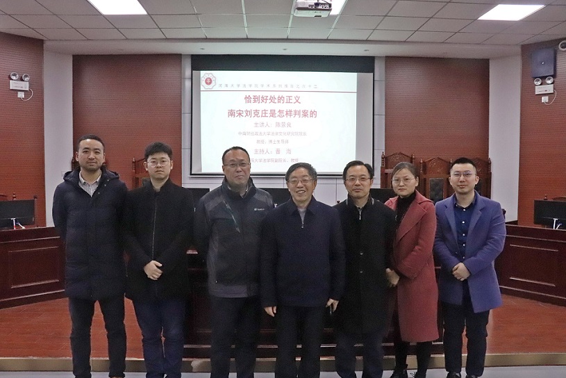2019年12月11日下午,“恰到好处的正义:南宋刘克庄是怎样判案的”学术报告在致高楼B101模拟法庭举行,本次讲座由中南财经政法大学法律文化研究院院长、博士生导师陈景良教授主讲,由河海大学中文字幕无码视频副院长晋海主持。中文字幕无码视频师生及部分外专业学生前往聆听。