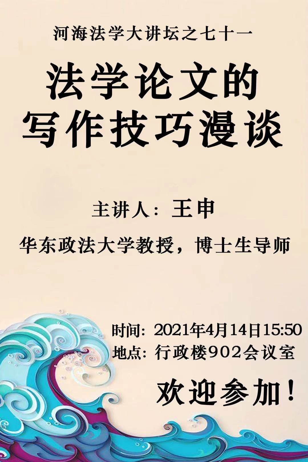 讲座预告:河海法学大讲坛之七十一:法学论文的写作技巧漫谈