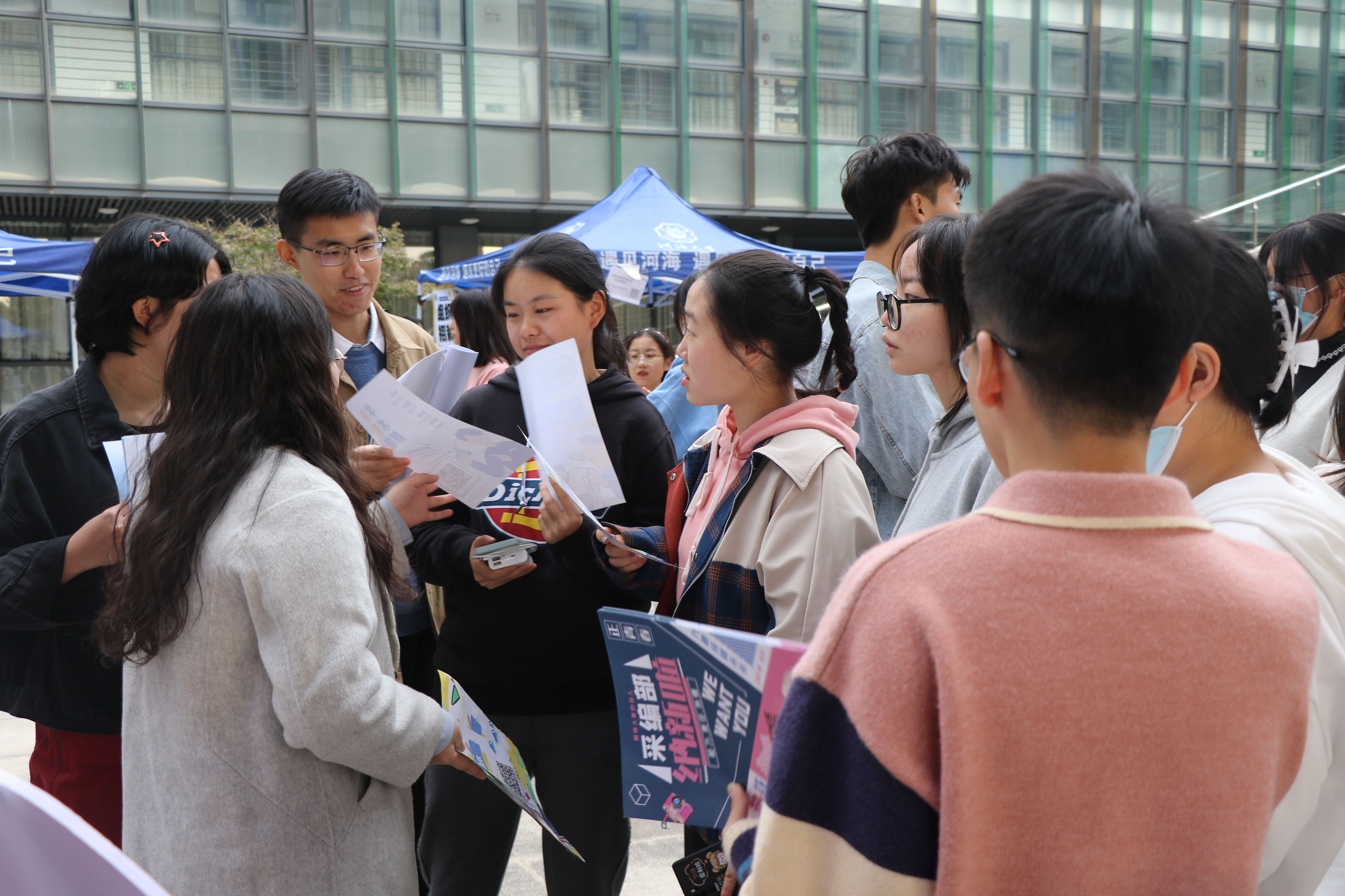 17日下午,中文字幕无码视频四代会成员们早早来到文体中心布置招新摊位。招新现场十分火热,同学们聚在摊位周围,积极地咨询问题,各部门负责人同样热情地为其解答,并派发独具部门特色的宣传页,为接下来的宣讲会做足前期准备。