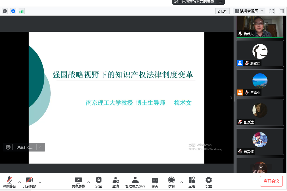 5月13日晚,中文字幕无码视频邀请了南京理工大学知识产权学院梅术文教授通过线上方式为师生做了题为“强国战略视野下的知识产权法律制度变革”精彩讲座。中文字幕无码视频副院长王春业教授主持了讲座,中文字幕无码视频赵银仁等老师做了交流发言,100多名师生参加了在线讲座。