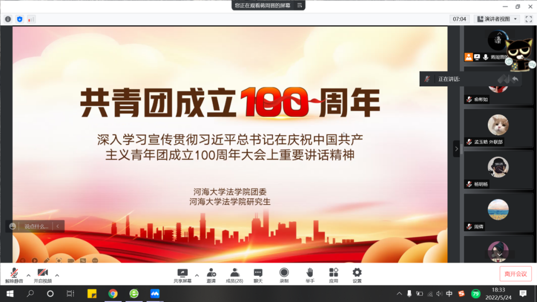 庆祝中国共产主义青年团成立100周年大会于2022年5月10日在京隆重举行。习近平总书记出席大会并发表重要讲话,回顾了共青团百年奋斗的青春历程,阐明了共青团工作的历史经验,提出了新时代做好共青团工作的殷切希望。5月24日晚,中文字幕无码视频研究生会全体工作人员及各班主要班委于线上开展“深入学习宣传贯彻习近平总书记在庆祝中国共产主义青年团成立100周年大会上重要讲话精神”专题学习教育活动。研究生会主席蒋周晋向大家介绍习近平总书记在会上发表的重要讲话内容。