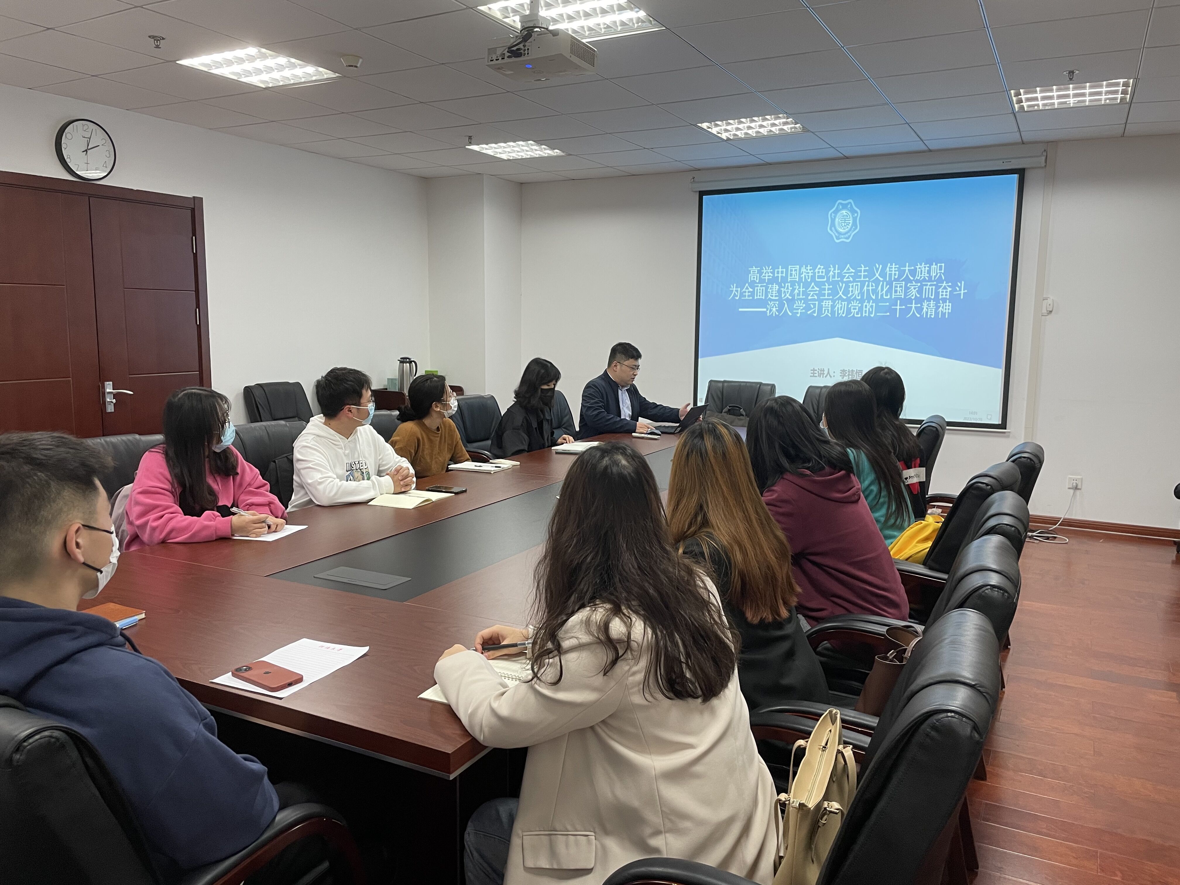 李祎恒副教授首先讲授了党的二十大召开的重要意义,指出党的二十大是我们党进入全面建设社会主义现代化国家新征程、向第二个百年奋斗目标进军的重要时刻召开的一次十分重要的代表大会,是党和国家政治生活中的一件大事。随后李祎恒副教授对党的二十大的精神要点进行了详细讲解,逐一讲授、分析了报告中的十五个主题,介绍了新时代新征程中国共产党的使命任务,进一步强调了坚持党的全面领导是坚持和发展中国特色社会主义的必由之路,中国特色社会主义是实现中华民族伟大复兴的必由之路。最后李祎恒副教授结合实际,要求大家将党的二十大精神作为学习研究的出发点和落脚点,在学懂、弄通、做实上下功夫,在实践中深入学习贯彻党的二十大精神。(供稿:陈文琪;审核:郭祥林)