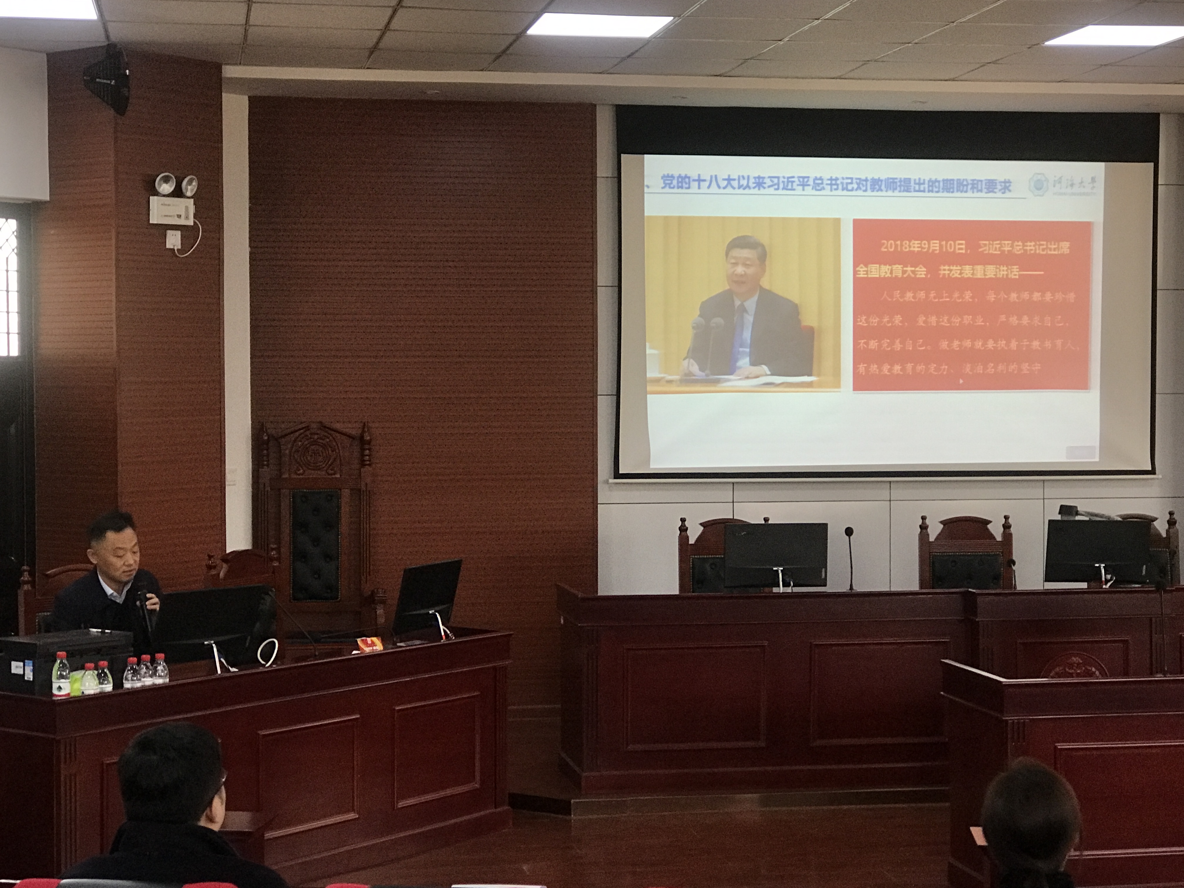 刘成钢书记做了 “2024年师德教育第一课”的主题报告,从新时代师德师风总体要求、新时代高校教师行为规范、违反教师职业道德典型案例三个方面开展教师思想政治和师德师风建设专题教育,要求教师强化职业自律,自觉践行新时代高校教师职业行为十项准则。会上刘书记还带领全体教师共同学习了《河海大学教师师德手册》部分章节内容。