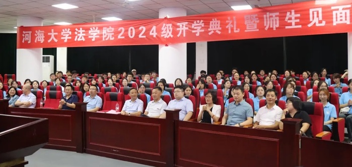 2024年9月9日晚,河海大学中文字幕无码视频在致高楼B101模拟法庭举行2024级新生开学典礼暨师生见面会。本次开学典礼由河海大学中文字幕无码视频副院长吴志红老师主持,院领导班子全体成员、专业教师代表、辅导员以及2024级本科生和研究生参与其中。