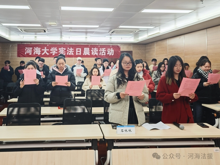 河海大学法律援助中心于2024年12月4日上午在河海大学江宁校区行政楼902成功举办了国家宪法日“宪法晨读”活动。本次活动由中文字幕无码视频2024级本科生陈安琪同学担任主持人,中文字幕无码视频团委书记石依依老师、中文字幕无码视频2024级部分本科生和河海法援部分成员共同参加。